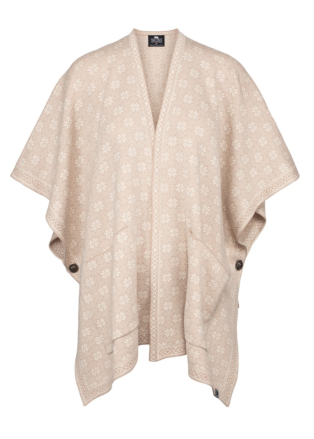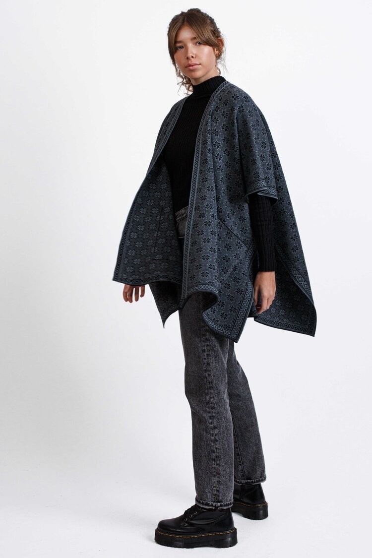 Inspired by the Norwegian snow crystal design, this poncho is both contemporary and versatile. With removable pins on the sides, it can easily be turned into a scarf.