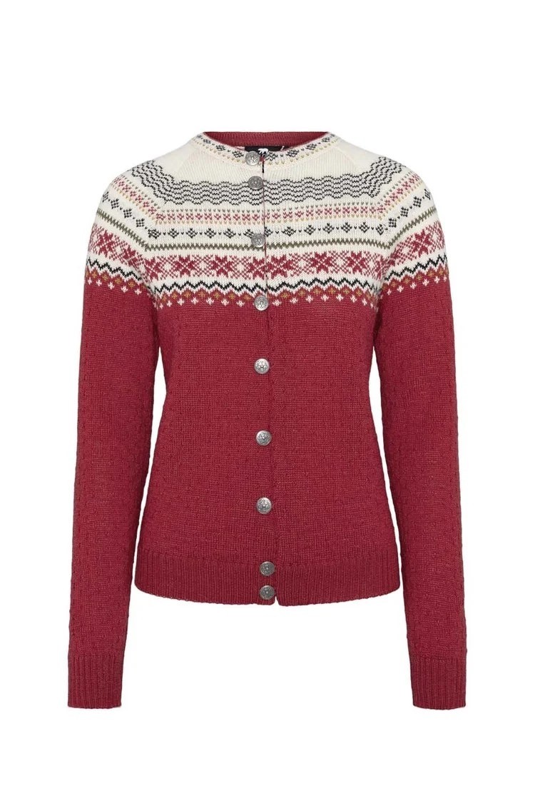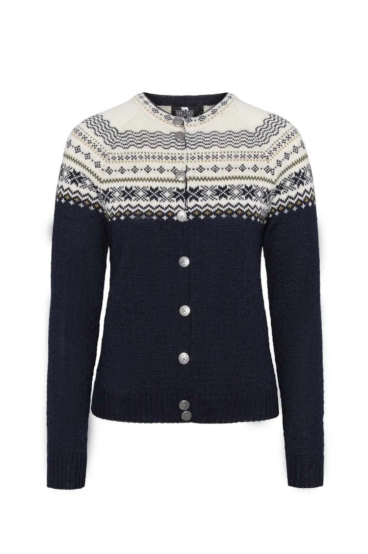 Traditional lightweight cardigan with pewter buttons and a tailored feminine fit. Tranditional Norwegian design with a snowflake pattern. A sporty and casual design that can be dressy as well. Perfect with a dress or jeans, you’re sure to be a crowd pleaser! 100% pure Norwegian wool.