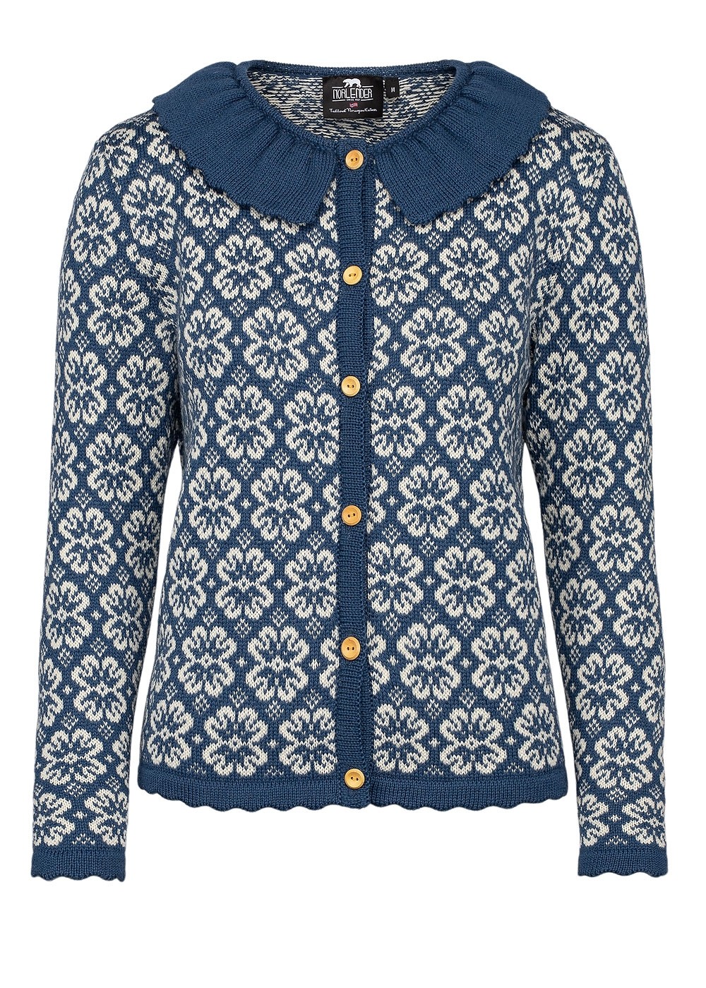 Norlender’s Lisa cardigan is a light weight retro Cardigan with a bold collar. It has wooden buttons and scalloped edge finishing.