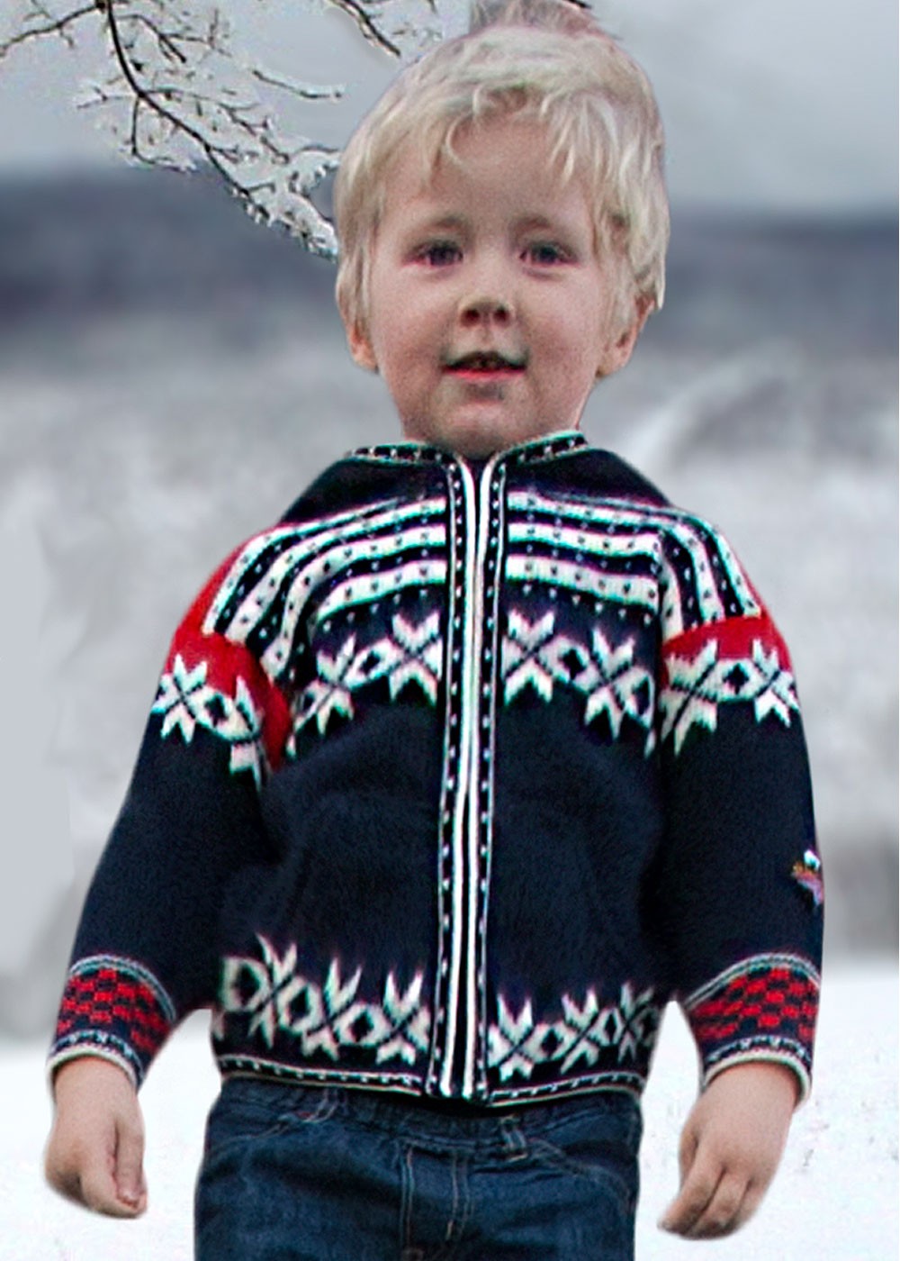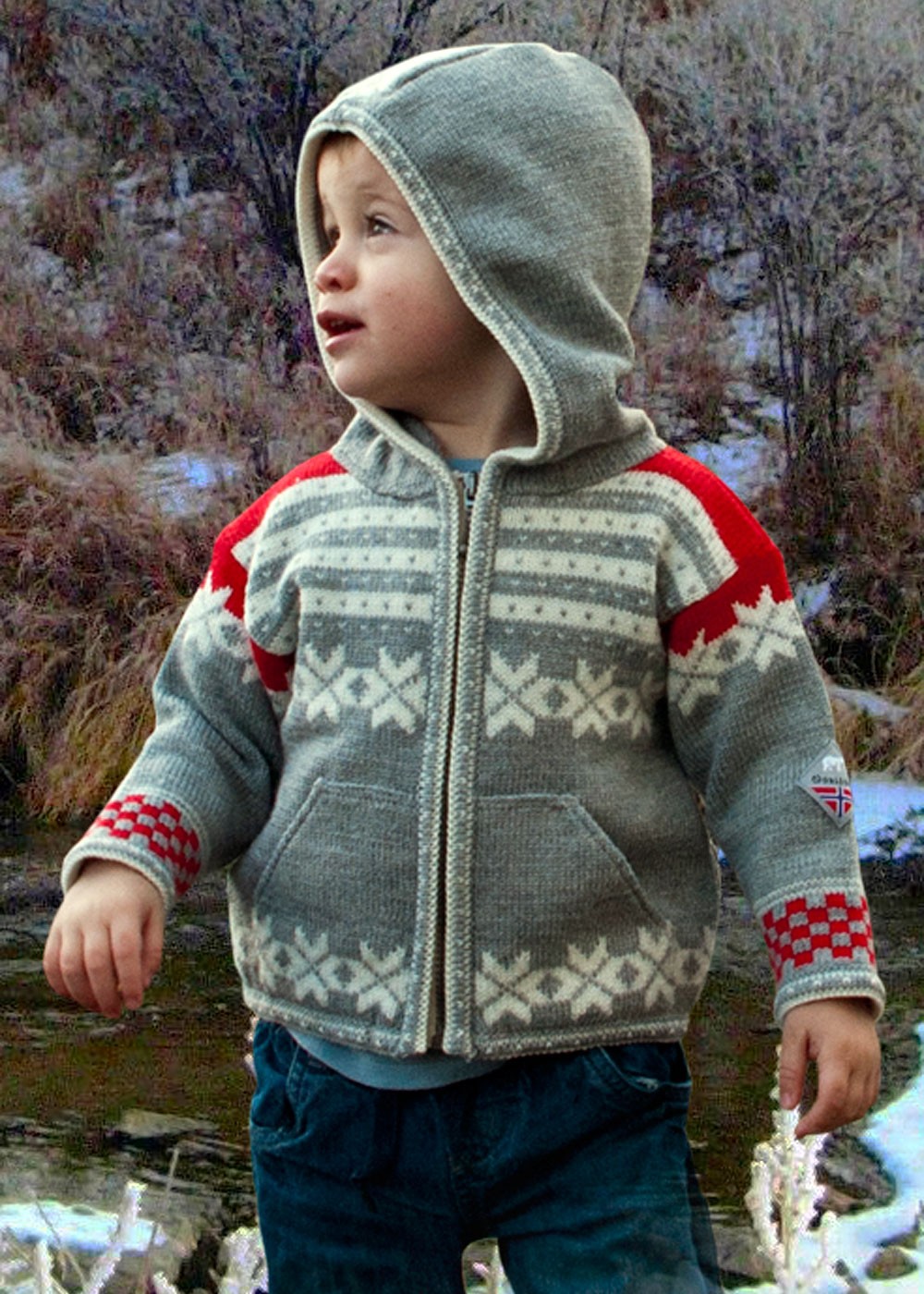 Dress your precious youngster for warmth and adorable-ness in this sporty cardigan jacket just oozing with personality. Magnificently constructed in 100% pure Norwegian wool with full zipper, two front pockets and a hood. Classic eight-petal rose pattern on the chest and hem is beautifully integrated with horizontal designs striping the upper chest, brightly capped shoulders and checkerboard cuffs. Matching hat and scarf sold separately.